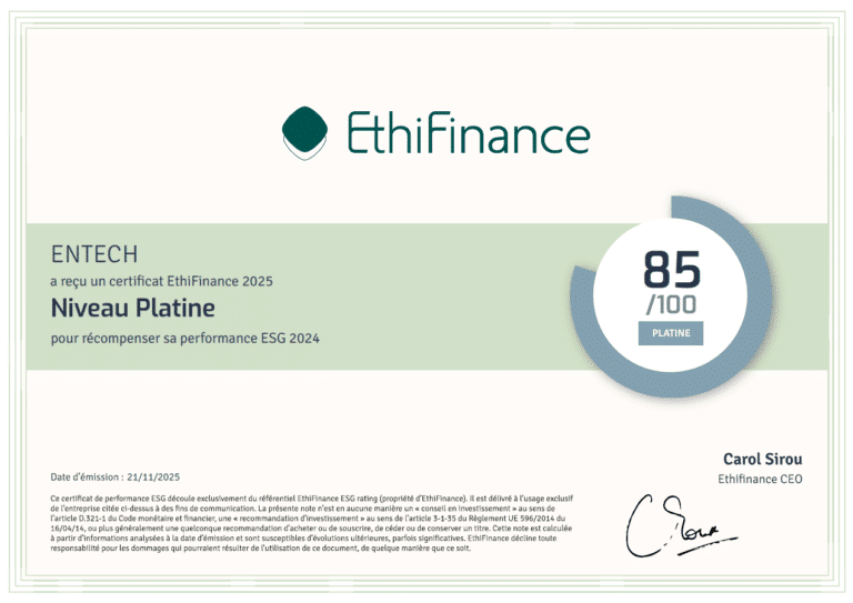 Depuis plusieurs années, Entech s’engage dans une démarche ESG rigoureuse, évaluée chaque année par l’agence indépendante EthiFinance via son référentiel de notation extra-financière. Celui-ci repose sur près de 140 critères répartis en quatre piliers : Environnement, Social, Gouvernance et Parties prenantes externes.