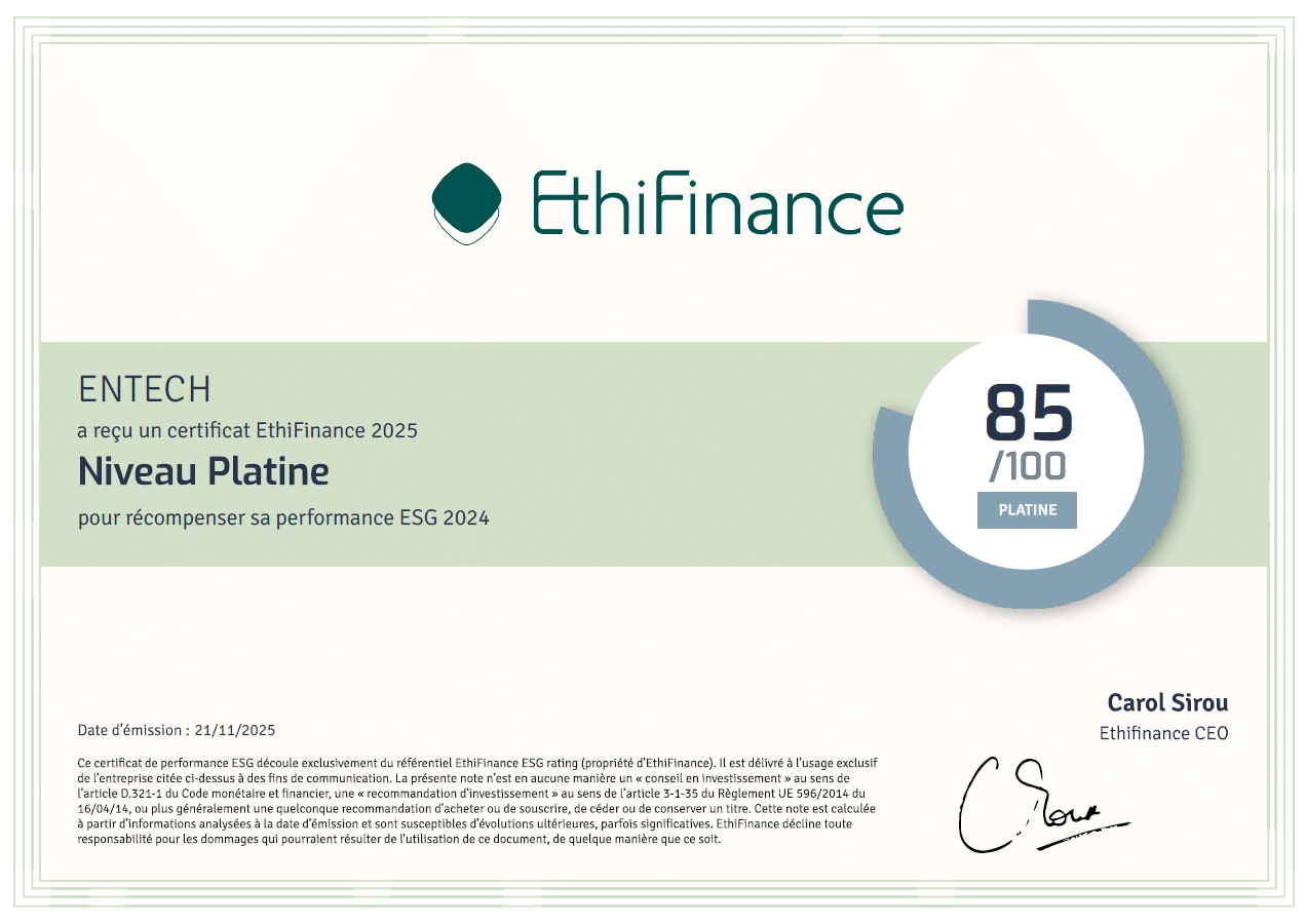 Entech publie sa notation extra-financière 2025 : 85/100 (Platine)