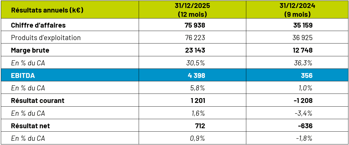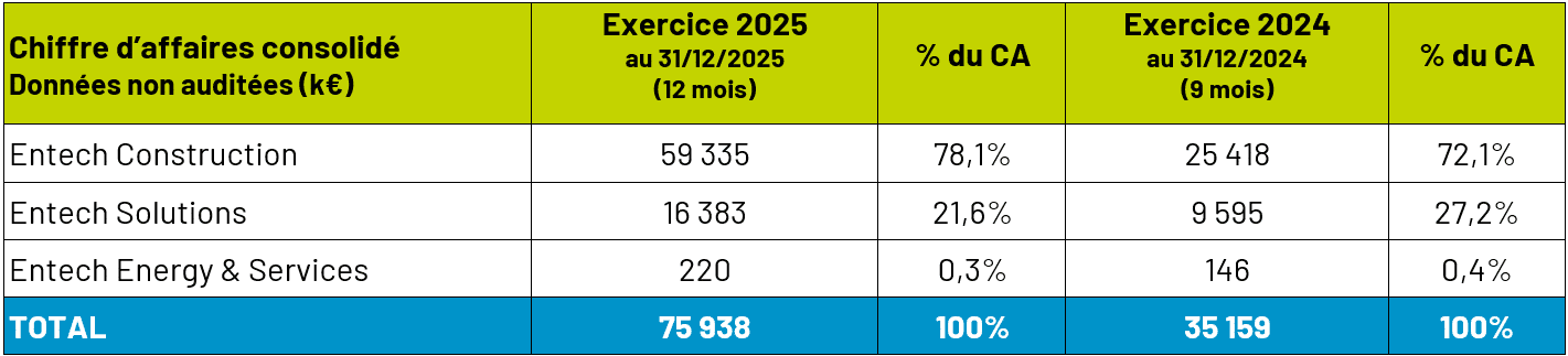 Entech a publié un chiffre d’affaires consolidé de 76 M€ au titre de l’exercice 2025, soit une progression de 62% (prorata temporis) comparé au chiffre d’affaires de l’exercice 2024 (exercice exceptionnel de 9 mois). Cette dynamique se traduit par une forte progression des résultats et un renforcement de la structure financière.