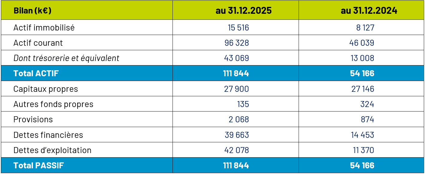 Le poste Disponibilités et VMP est en progression de 30 061 k€ du fait, d’une part, d’encaissements importants en fin de période et, d’autre part, de l’augmentation de la ligne de RCF d’Entech en décembre. Les dettes financières augmentent de 25 210 k€. Cette hausse de l’endettement financier est liée, d’une part, à l’émission d’un emprunt obligataire de 15 000 k€ pour amorcer le financement de notre filiale Entech Energy & Services, et, d’autre part, la hausse de notre RCF dans le cadre du renouvellement de la syndication bancaire d’Entech qui se traduit par une position de 20 000 k€ au 31 décembre 2025 contre 11 000 k€ au 31 décembre 2024.